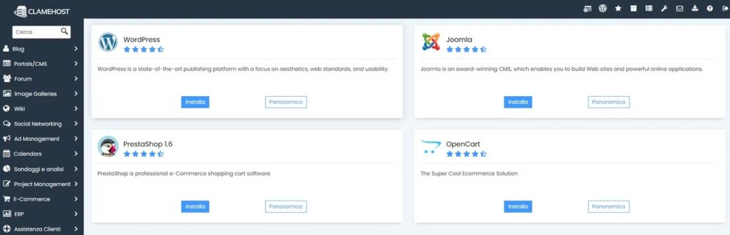 ClameHost offre gratuitamente Softaculous su tutti i nostri piani hosting. Con Softaculous, puoi installare oltre 400 applicazioni come WordPress, Joomla, PrestaShop, OpenCart, Drupal, forum, wiki, gallerie fotografiche e CMS di project management con pochi click. L’installazione è guidata, semplice e aggiornata all’ultima versione stabile. Non è necessario creare database o caricare file: Softaculous si occupa di tutto!